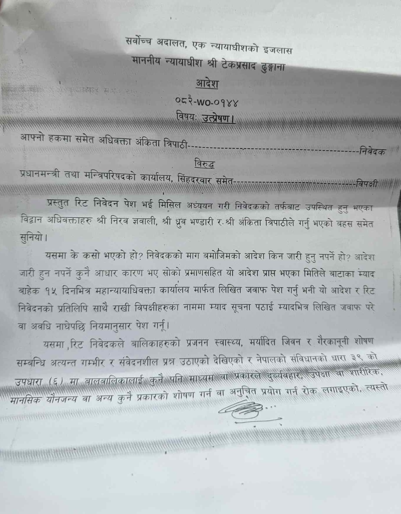 सर्वोच्चको आदेशमा भनिएको छ, ‘संवैधानिक व्यवस्था र कानुनी प्रावधानको आलोकमा हेर्दा बालबालिकाको मौलिक हक संरक्षण गर्नु विपक्षीहरु (सरकार) को संवैधानिक कर्तव्य रहेको, बालिका तथा किशोरीहरु शोषण हुन सक्ने जोखिम र सुविधा सन्तुलनलाई समेत दृष्टिगत गरी प्रस्तुत रिट निवेदनको अन्तिम टुंगो नलागेसम्म नेपाल राज्यभर महिला तथा बालबालिकाबाट डिम्ब निष्काशन तथा भण्डारण गर्ने कार्यमा रोक लगाई सरकारको नियमन र निगरानी प्रभावकारी बनाउनू ।’