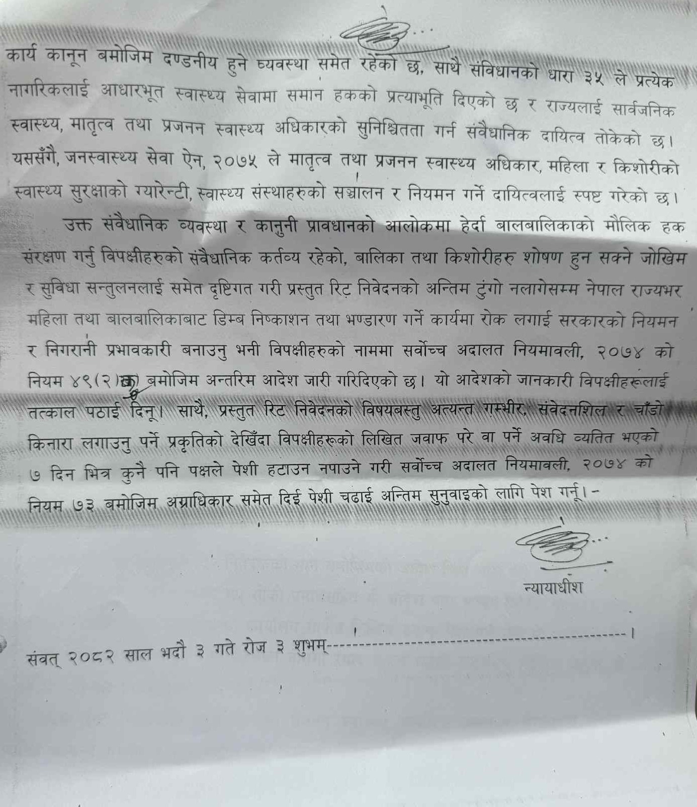 –संविधानले सुनिश्चित गरेको प्रजनन अधिकारको उद्देश्य महिलाको स्वतन्त्रता हो, तर त्यो स्वतन्त्रता शोषण वा व्यापारीकरणमा परिणत हुने अधिकार होइन।