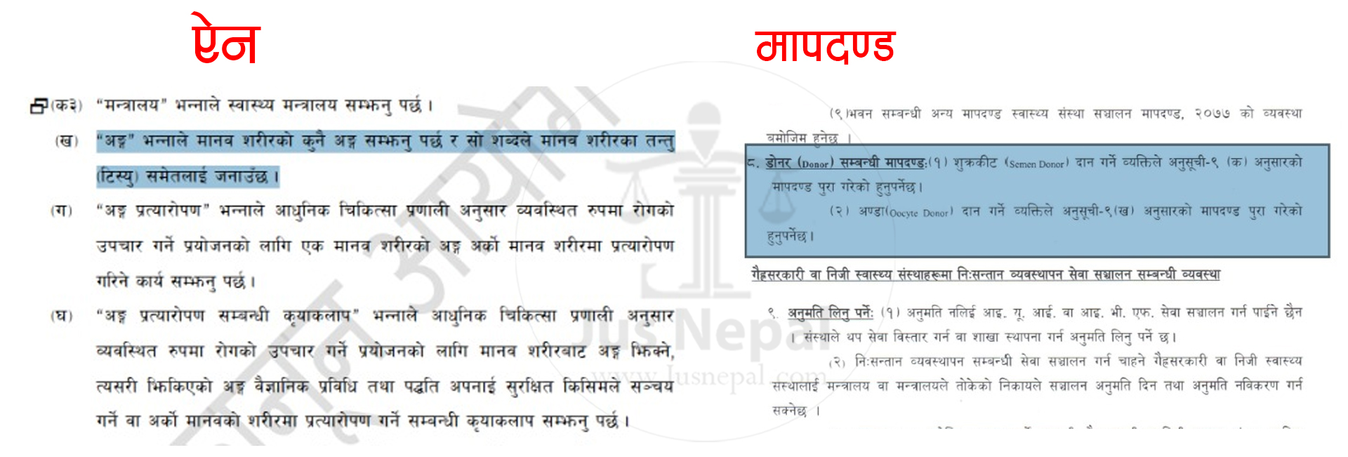 मन्त्रालयले बनाएको मापदण्डकै कुरा गर्ने हो भने पनि शुक्रकीट र अण्डा दान गर्ने व्यक्ति भनिएको छ । ‘विक्री गर्ने’ भनिएको छैन । यसको अर्थ कानूनत: शुक्रकीट वा अण्डा बेचबिखन गर्न पाइँदैन, मृगौला या कलेजो जस्तै नातेदारलाई दिन या नातेदारबाट सेवाभाव अनुसार लिन मात्र पाइन्छ ।