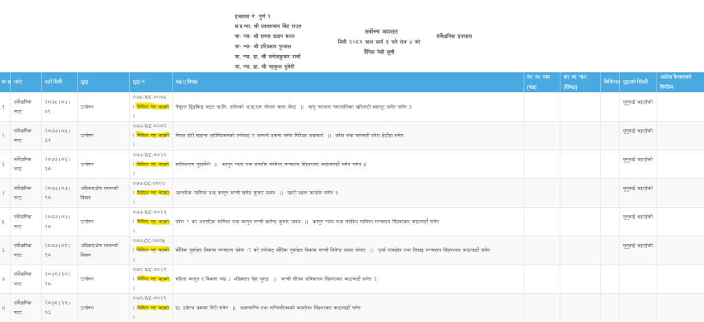 त्यस्तै टेकप्रसाद ढुङ्गाना र शान्तिसिंह थापाको संयुक्त इजलासका ५३ मध्ये १६, सुनील कुमार पोखरेल र नृपध्वज निरौलाको संयुक्त इजलासका ४६ मध्ये १७ मुद्दाको मिसिल नष्ट भएका छन् । बुधबारका लागि पेसी तोकिएको संवैधानिक इजलासमा १५ मध्ये १५ वटै मुद्दाका मिसिल नष्ट भएको पाइएको छ ।