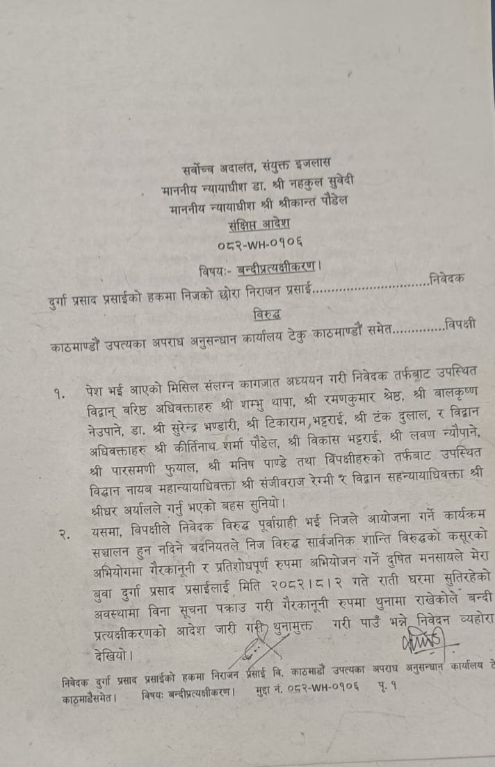 काठमाडौं । मेडिकल व्यवासायी दुर्गा प्रसाईलाई थुना मुक्त गर्न सर्वोच्च अदालतले आइतबार बन्दी प्रत्यक्षीकरणको आदेश दिएको छ ।