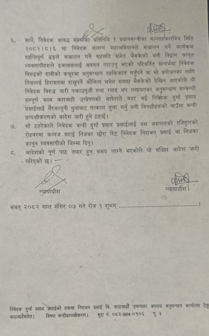 न्यायाधीशद्वय नहकुल सुवेदी र श्रीकान्त पौडेलको इजलासले आइतबार प्रसाईलाई छाड्न बन्दी प्रत्यक्षीकरणको आदेश दिएको हो ।