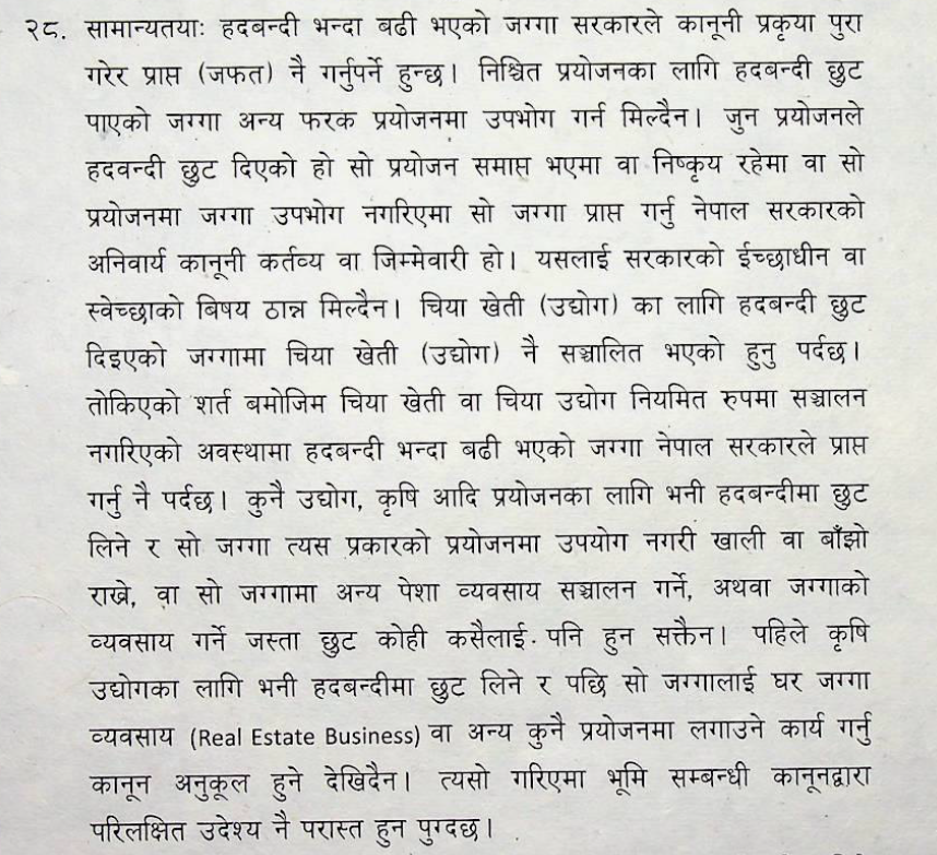 ‘कुनै उद्योग, कृषि आदि प्रयोजनका लागि भनी हदबन्दीमा छुट लिने र सो जग्गा त्यस प्रकारको प्रयोजनमा उपयोग नगरी खाली वा बाँझो राखे, वा सो जग्गामा अन्य पेशा व्यवसाय सञ्चालन गर्ने, अथवा जग्गाको व्यवसाय गर्ने जस्ता छुट कोही कसैलाई पनि हुन सक्तैन ।’