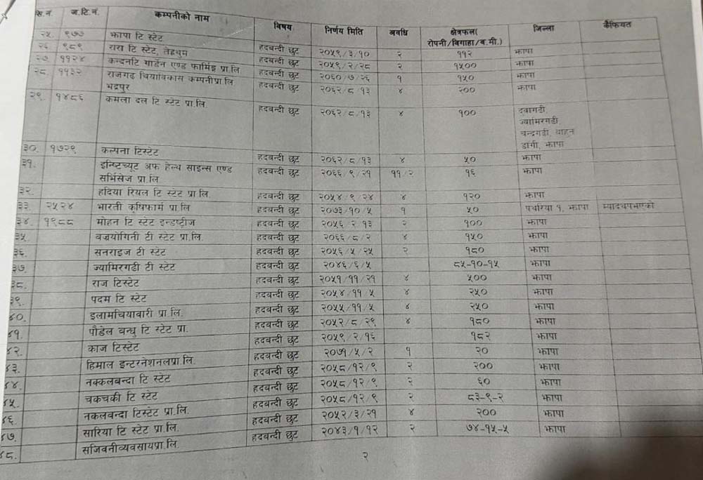 नेपाल सरकारले २०६३ सालयता १९० भन्दा बढी कम्पनीलाई जग्गामा हदबन्दी छुट दिने निर्णय गरेको पाइएको छ । त्यसरी हदबन्दी छुट लिने कम्पनीहरुमा झापा जिल्लाका चिया बगानहरु अत्यधिक छन् ।