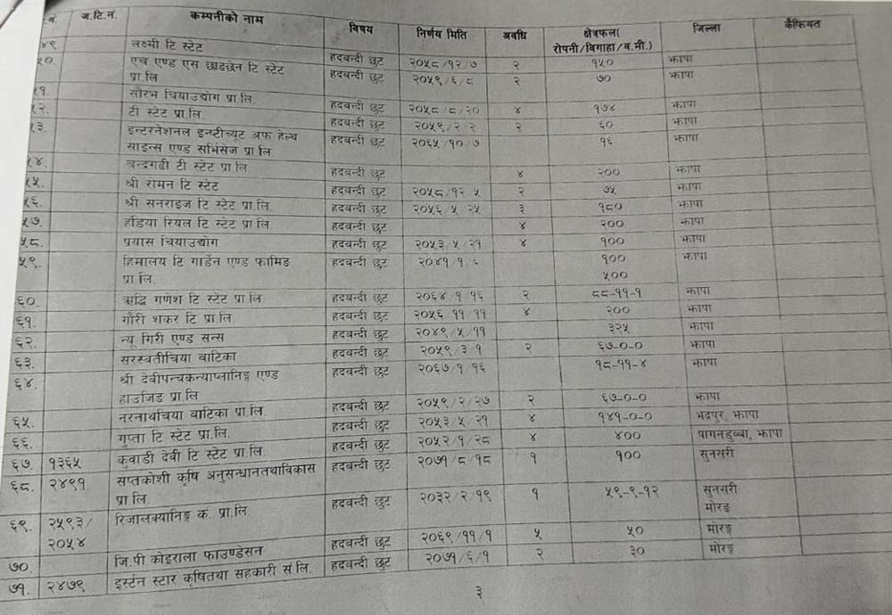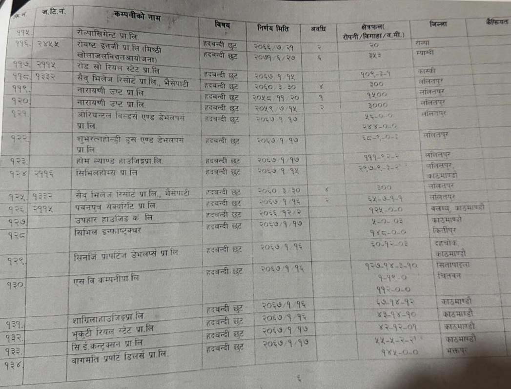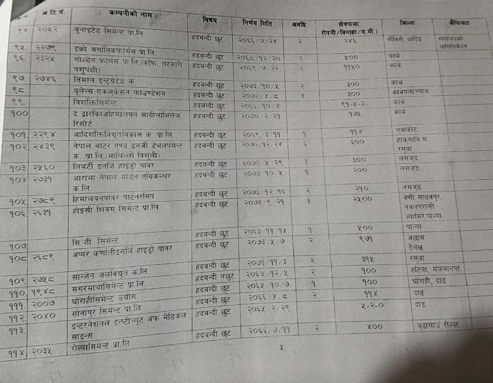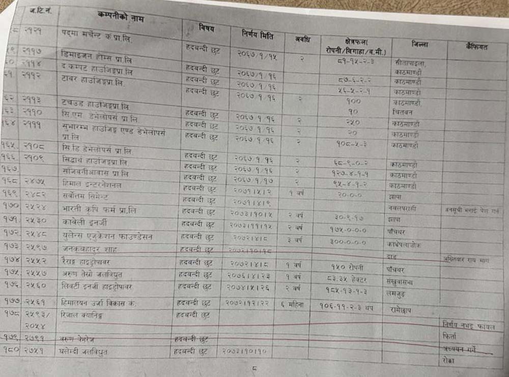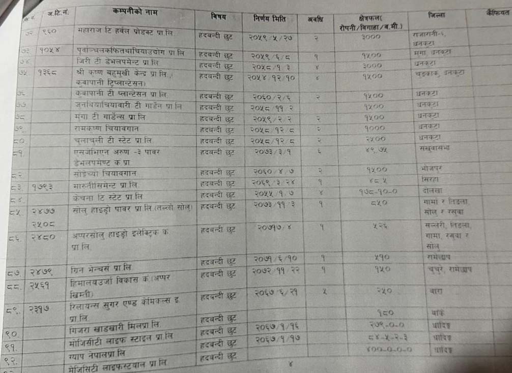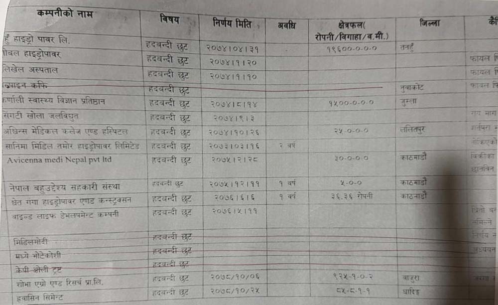 हेर्नुहोस् १५ वर्षमा हदबन्दी छुट पाउने कम्पनीहरुको सूची-