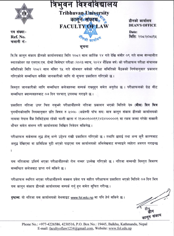 त्रिवि कानुन संकायको डीन कार्यालयले गत मंसिर ९ गते सञ्चालित एलएल.एम. तह ( ४ सेमेष्टर समूह) को दोस्रो सेमेष्टर र एलएल.एम. तह (६ सेमेष्टर समुह) को दोश्रो सेमेष्टरका नियमित र आशिंक दुवैको नतिजा सोमबार (मंसिर १५ गते) प्रकाशित गरेको हो ।