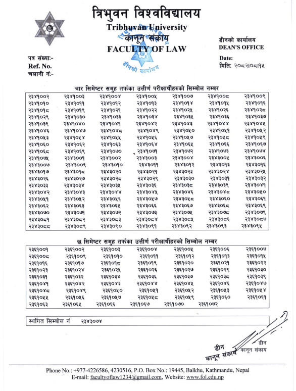 कानून संकाय, डीनको कार्यालयले पाँचवर्षे बीए.एलएल.बी.र एलएल.एम. तीनवर्षे र दुई वर्षे) को परीक्षा सञ्चालन र नतिजा प्रकाशन गर्दै आएको छ ।