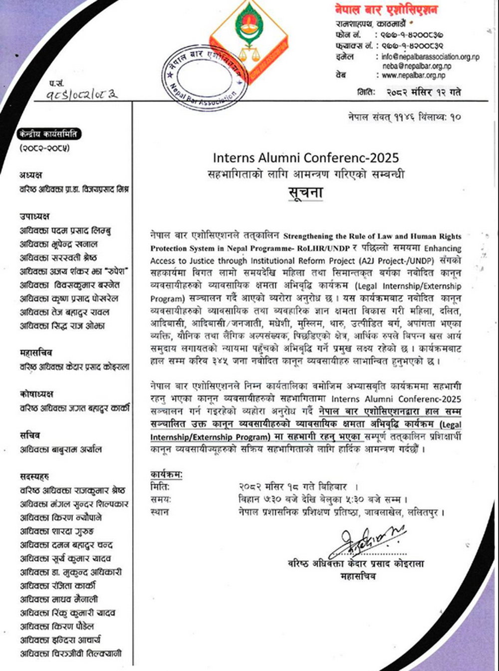 नेपाल बार एशोसिएशनले तत्कालीन Strengthening the Rule of Law and Human Rights Protection System in Nepal Programme- RoLHR/UNDP र पछिल्लो समयमा Enhancing Access to Justice through Institutional Reform Project (A2J Project-/UNDP) सँगको सहकार्यमा विगत लामो समयदेखि महिला तथा सीमान्तकृत वर्गका नवोदित कानून व्यवसायीहरुको व्यावसायिक क्षमता अभिवृद्धि कार्यक्रम (Legal Internship/Externship Program) सञ्चालन गर्दै आएको कोइरालाको भनाइ छ ।