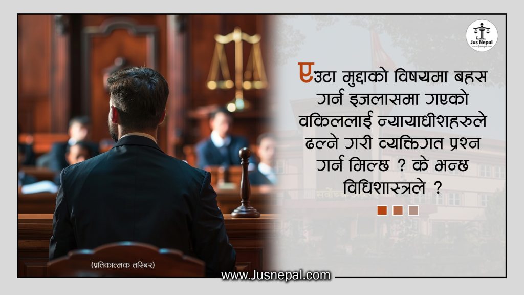 काठमाडौं । सम्मानित सर्वोच्च अदालतको संवैधानिक इजलासमा बुधबार न्यायाधीशहरुको प्रश्नका कारण एकजना कानून व्यवसायी मुर्छित भएर ढलेको घटना न्याय क्षेत्रमा चर्चाको विषय बनेको छ । उक्त घटनालाई लिएर एकजना नागरिकले जस नेपालसँग प्रश्न गरे, ‘एउटा मुद्दाको विषयमा बहस गर्न गएको वकिललाई न्यायाधीशहरुले यसरी ढल्ने गरी व्यक्तिगत प्रश्न गर्न मिल्छ ? यसबारे विधिशास्त्रले के भन्छ ?’ … Continue reading संवैधानिक इजलासमै वकील ढलेपछि उब्जिएको प्रश्न