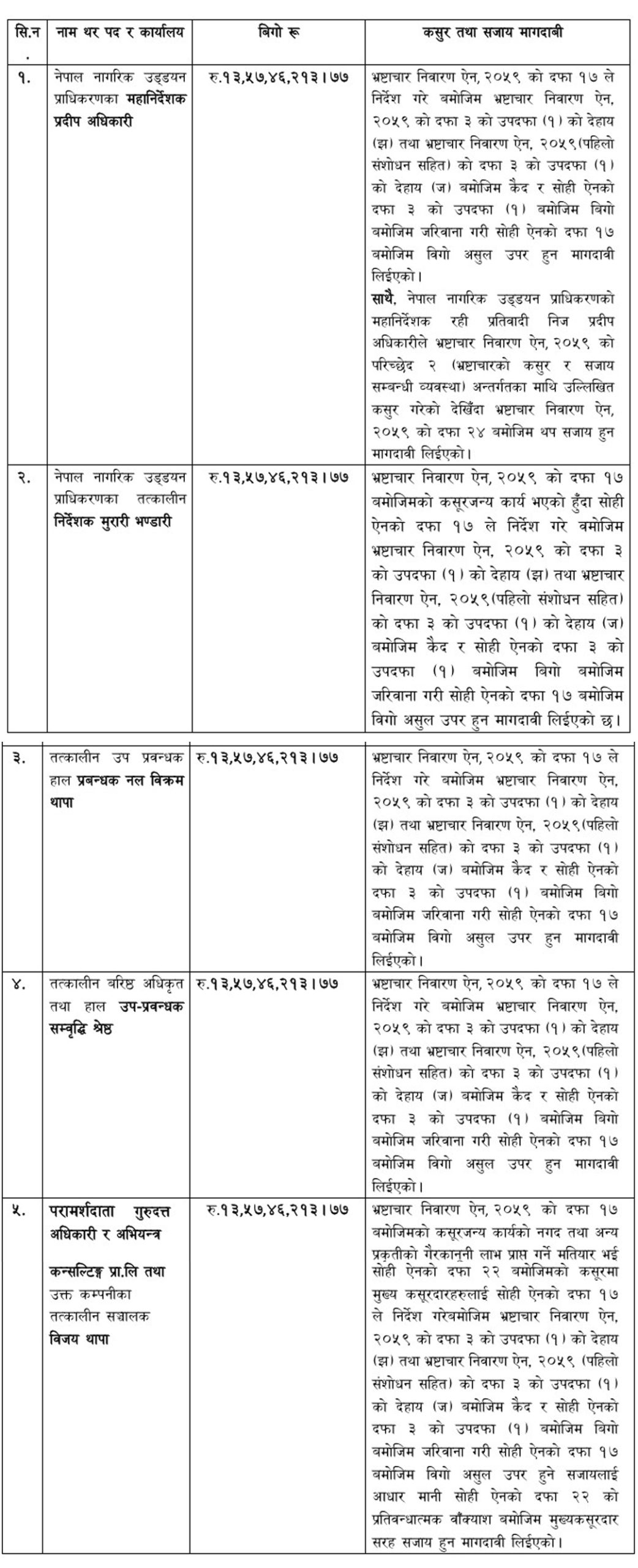 अख्तियारका प्रवक्ता राजेन्द्र कुमार पौडेलद्वारा जारी विज्ञप्तिअनुसार मंगलबार मुद्दा चलाइएका व्यक्तिहरुमा महानिर्देशक अधिकारीसहित प्राधिकरणका प्रबन्धक नलविक्रम थापा, उपप्रबन्धक समृद्धि श्रेष्ठ, पूर्वनिर्देशक मुरारी भण्डारी, हेलिपोर्ट निर्माणसम्बन्धी परामर्शदाता गुरुदत्त अधिकारी र ठेकेदार अभियन्त्र कन्सल्टिङ प्रालिका सञ्चालक विजय थापासमेत रहेका छन् ।