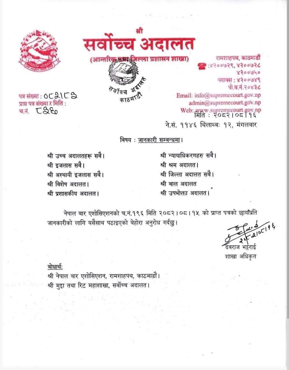 सर्वोच्च अदालतले देशभरिका उच्च अदालत, त्यसअन्तर्गतका इजलासहरु, अस्थायी इजलास, विशेष अदालत र प्रशासकीय अदालतमा पनि कानून व्यवसायी वा मुद्दाका सरोकारवालाले निवेदन दिएमा पेशी स्थगन गरिदिन सर्कुुलर गरेको छ।