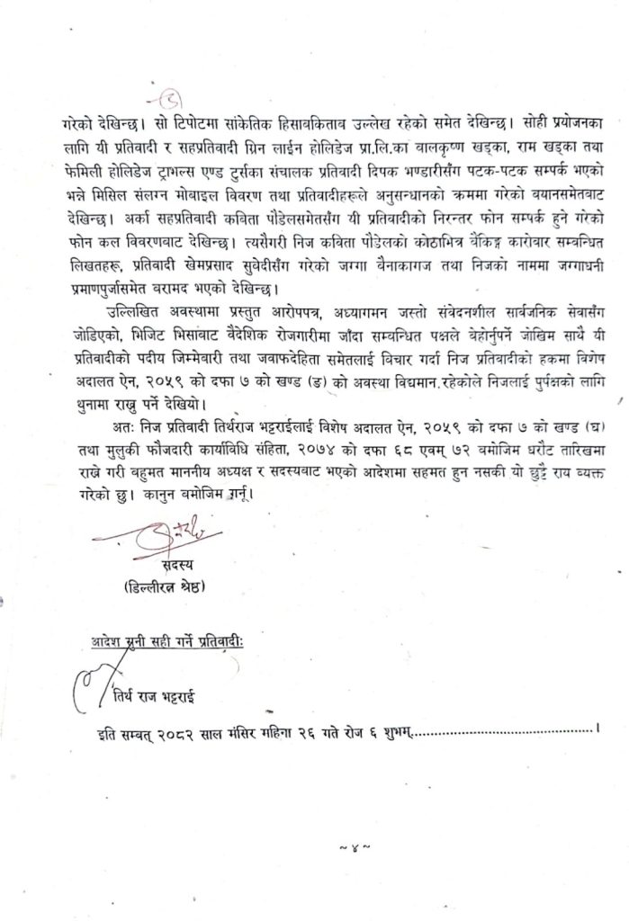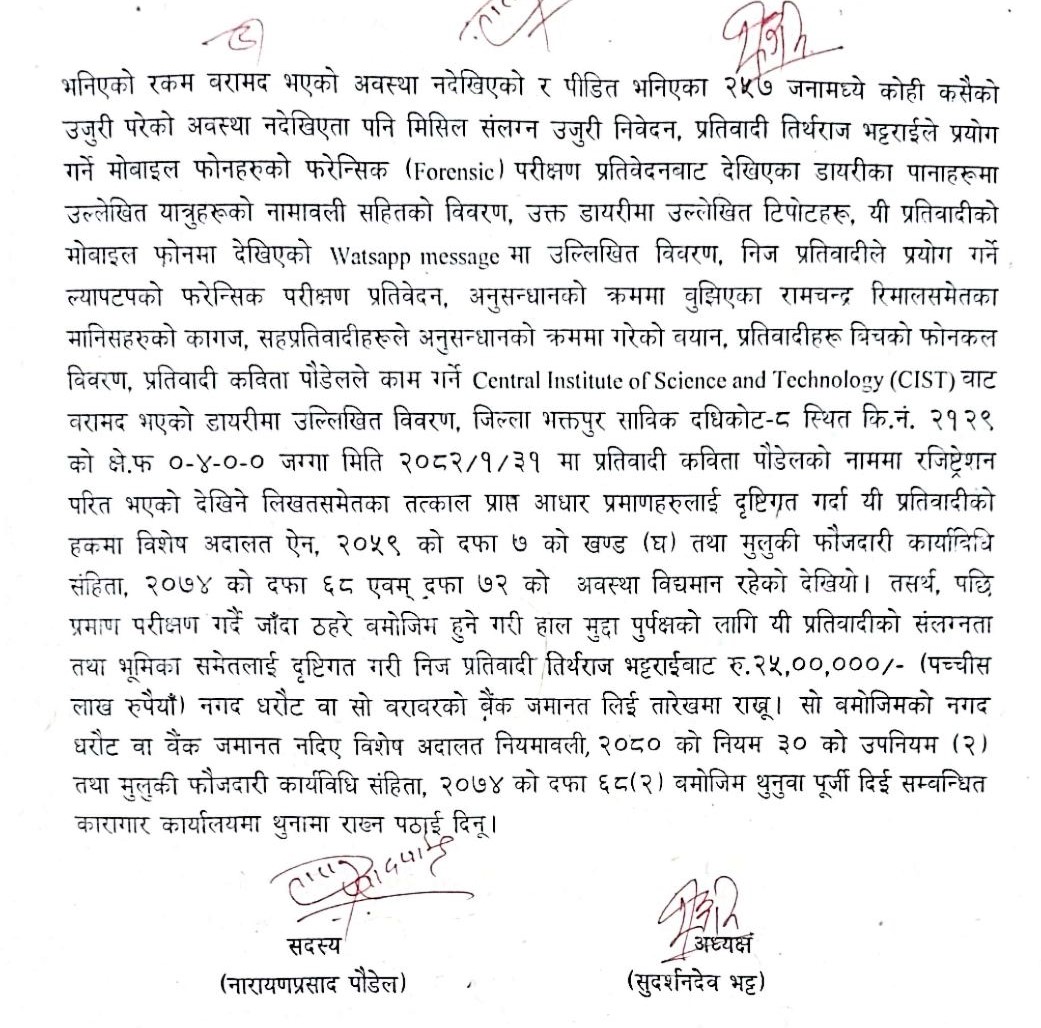 भट्टराईलाई धरौटीमा छाड्ने आदेशमा विशेष अदालतका दुईजना न्यायाधीशहरु, अध्यक्ष सुदर्शनदेव भट्ट र सदस्य नारायणप्रसाद पौडेलको हस्ताक्षर छ ।