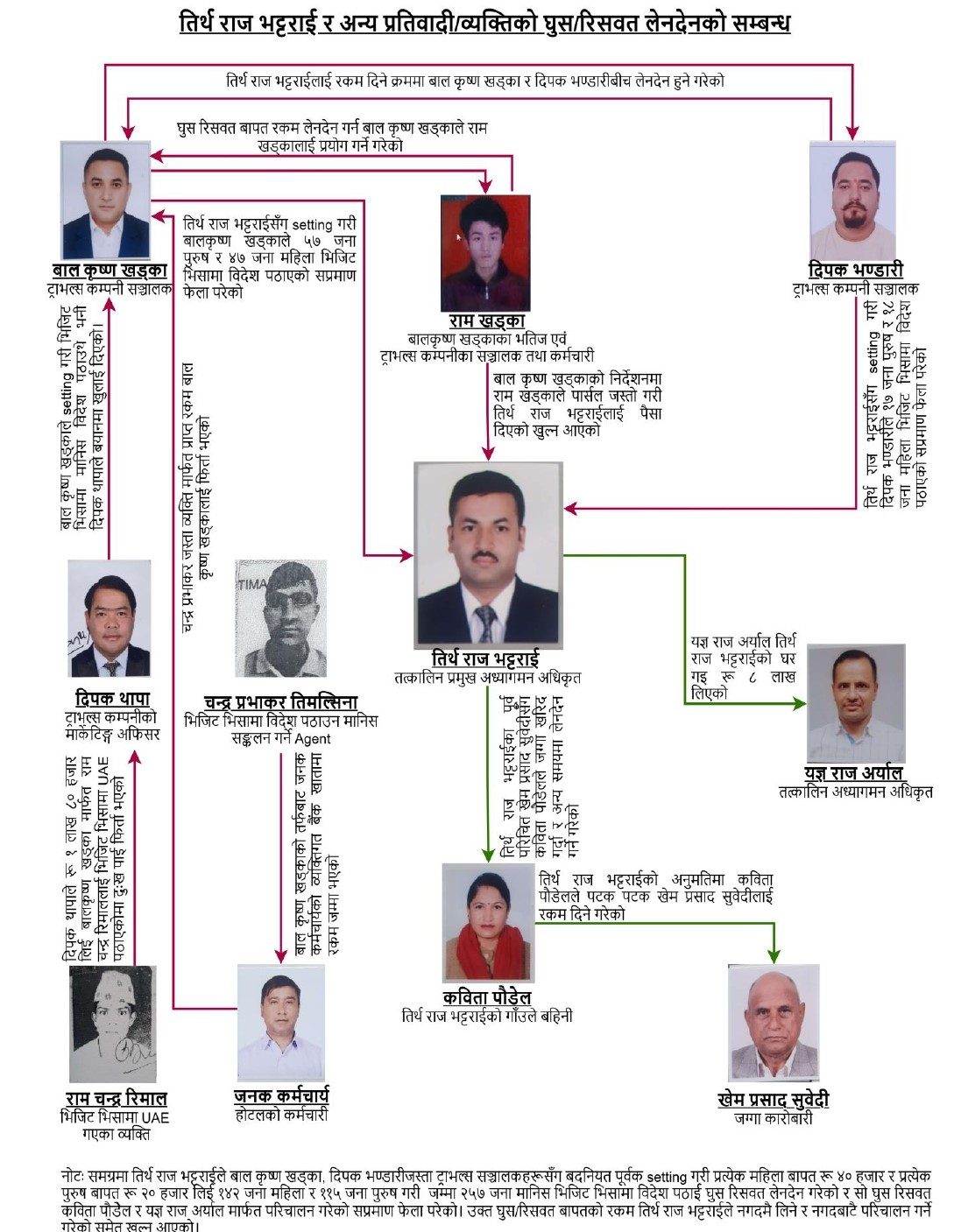 अख्तियारले आफ्नो अभियोग पत्रमा मुख्य प्रमाणको आधारका रुपमा तत्कालीन प्रमुख भट्टराईले ग्रिनलाइन होलिडेज प्रालिका बालकृष्ण खड्का, राम खड्का र फेमली होलिडेज ट्राभल्स एण्ड टुर्स प्रालिका सञ्चालक दीपक भण्डारीसँग निरन्तर सम्पर्क र लेनदेन गरेको विषयलाई उल्लेख गरेको छ । उनीहरूबाट भिजिट भिसामा जाने यात्रुको नामावली पहिल्यै प्राप्त गरी अध्यागमन प्रक्रियामा ‘म्यानेज’ गरिएको अख्तियारको आरोप थियो ।