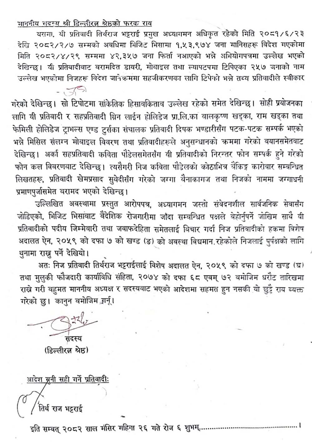 अभियोग लागेका तीर्थराज भट्टराई, कविता पौडेल लगायतका प्रतिवादीहरुलाई अहिले नै दोषी हुन् भनेर ठोकुवा गरिहाल्न सकिँदैन । यो सम्मानित अदालतमा विचाराधीन विषय हो ।