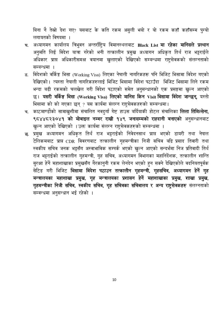 साथै, भट्टराईले अध्यागमन अधिकृत यज्ञराज अर्याललाई घरमै बोलाएर आठ लाख रुपैयाँ बाँडफाँट गरेकोसमेत अख्तियारको दाबी थियो ।