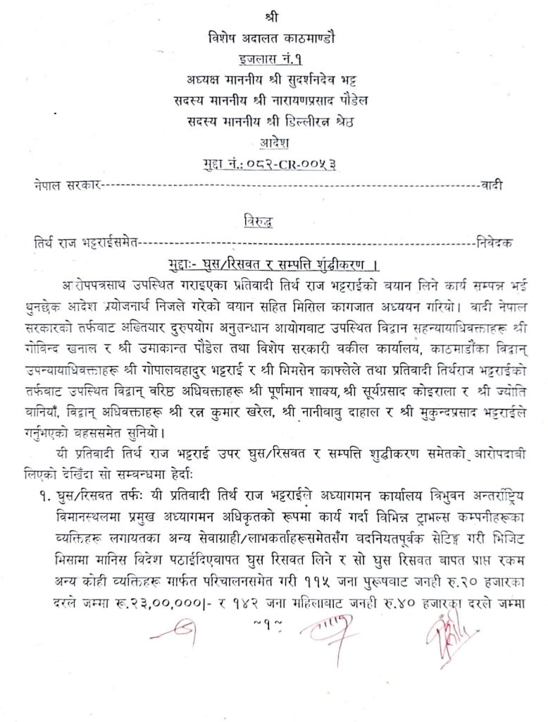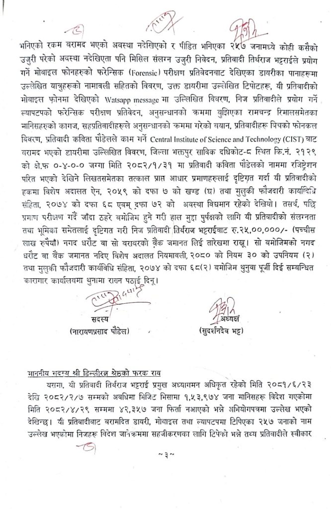 भट्टराईलाई धरौटीमा छाड्ने आदेशमा विशेष अदालतका दुईजना न्यायाधीशहरु, अध्यक्ष सुदर्शनदेव भट्ट र सदस्य नारायणप्रसाद पौडेलको हस्ताक्षर छ ।