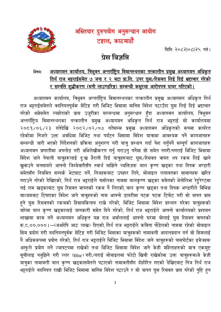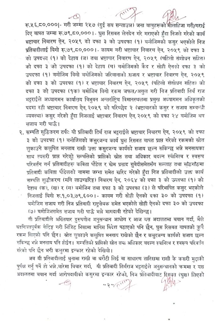 त्रिभुवन अन्तर्राष्ट्रिय विमानस्थल अध्यागमन कार्यालयका तत्कालीन प्रमुख तथा सहसचिव भट्टराईसहित ६ जनाविरुद्ध अख्तियार दुरुपयोग अनुसन्धान आयोगले विशेष अदालतमा भ्रष्टाचारसम्बन्धी मुद्दा दायर गरेको थियो ।