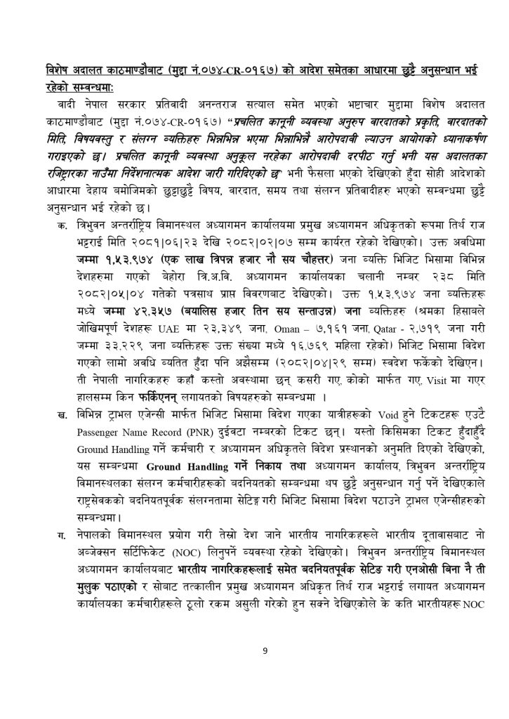 यद्यपि अख्तियारका अनुसार यस प्रकरणसँग जोडिएका थप आयामहरु भने केलाउन बाँकी छ । भिजिट भिसामा गएका हजारौँ नेपाली अझै स्वदेश नफर्किएको अवस्था छ । एनओसी बिना तेस्रो देश गएका भारतीय नागरिक, ब्ल्याकलिस्टमा रहेका व्यक्तिको प्रस्थान, वर्किङ भिसा भएका नागरिकलाई भिजिट भिसामा पठाउने चलखेल तथा उच्च राजनीतिक तहसँगको सम्भावित साँठगाँठ जस्ता विषयहरु अझै अनुसन्धानकै चरणमा रहेको अख्तियारको दाबी छ ।