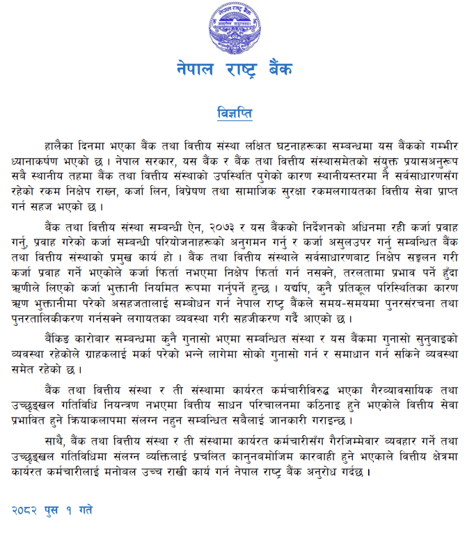 बैंक तथा वित्तीय संस्था र ती संस्थामा कार्यरत कर्मचारीसँग गैरजिम्मेवार व्यवहार गर्ने तथा उच्छृङ्खल गतिविधिमा संलग्न व्यक्तिलाई प्रचलित कानुनबमोजिम कारबाही हुने भएकाले वित्तीय क्षेत्रमा कार्यरत कर्मचारीलाई मनोबल उच्च राखी कार्य गर्न नेपाल राष्ट्र बैंकले अनुरोध गरेको छ ।