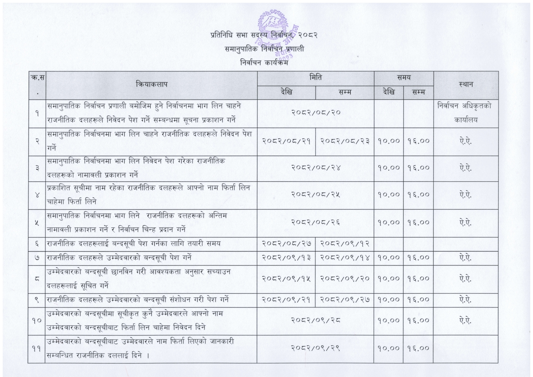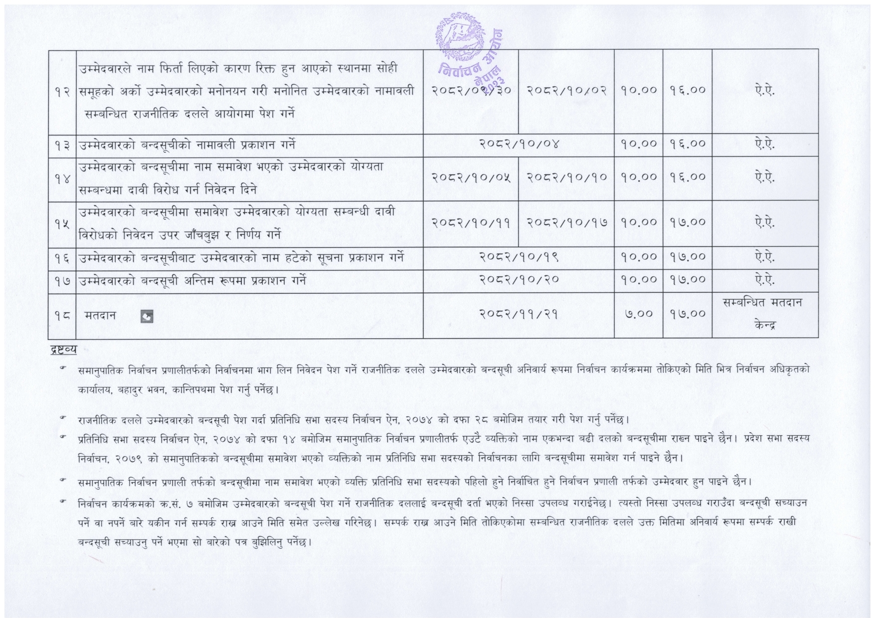 आयोगबाट प्रकाशित निर्वाचन कार्यक्रमअनुसार मंसिर २७ देखि पुस १२ सम्म दलहरुले समानुपातिकतर्फका उम्मेदवारहरुको बन्दसूची पेश गर्नका लागि तयारी गर्ने समय हो।