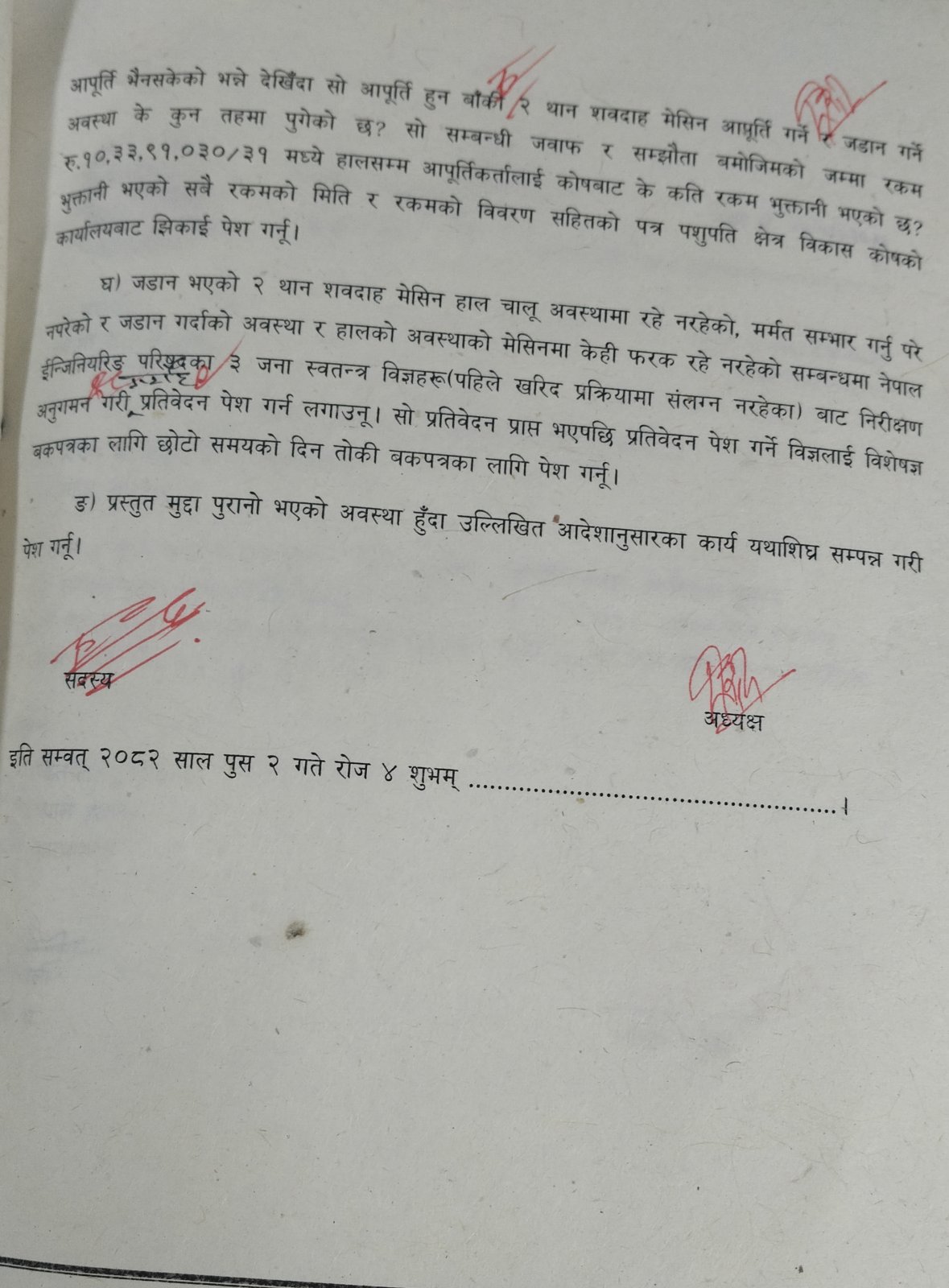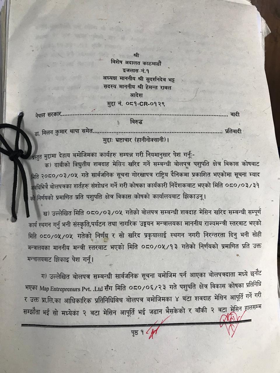 यस्तै, शवदाह मेसिन आपूर्तिका लागि म्याप इन्टरप्रेनर्स प्रालिसँग असोज २३ गते भएको सम्झौता, चारमध्ये दुईवटा मेसिन जडान भइसकेको र बाँकी दुईवटा मेसिनको हालको अवस्था, सम्झौता बमोजिम १० करोड ३३ लाख ९१ हजार ३० रुपैयाँमध्ये हालसम्म भुक्तानी भएको रकम, मिति र विवरणसहितको कागजात पेश गर्न पनि अदालतले निर्देशन दिएको छ ।