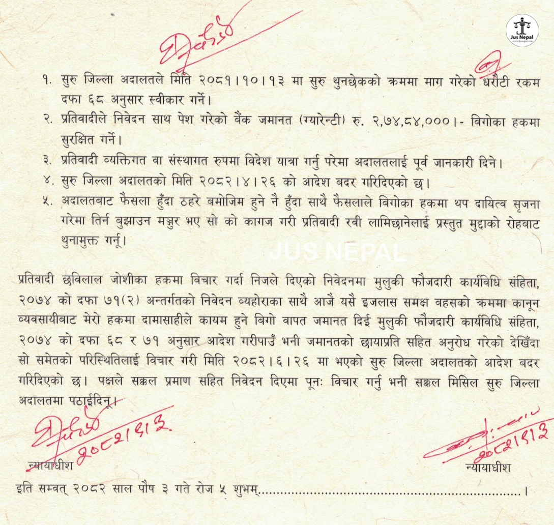 सुरु जिल्ला अदालतले २०८१ माघ १३ मा मागेको धरौटी रकम स्वीकार गर्न, बिगोका हकमा बैङ्क ग्यारेन्टी राख्न, अदालतलाई पूर्व जानकारी दिएर मात्रै विदेश जान र मुद्दाको फैसला हुँदा बिगोका हकमा थप दायित्व तिर्न बुझाउन मञ्जुर रहेको भनी कागज गर्नुपर्ने शर्त स्वीकार्नुपर्ने आदेशमा लेखिएको छ ।