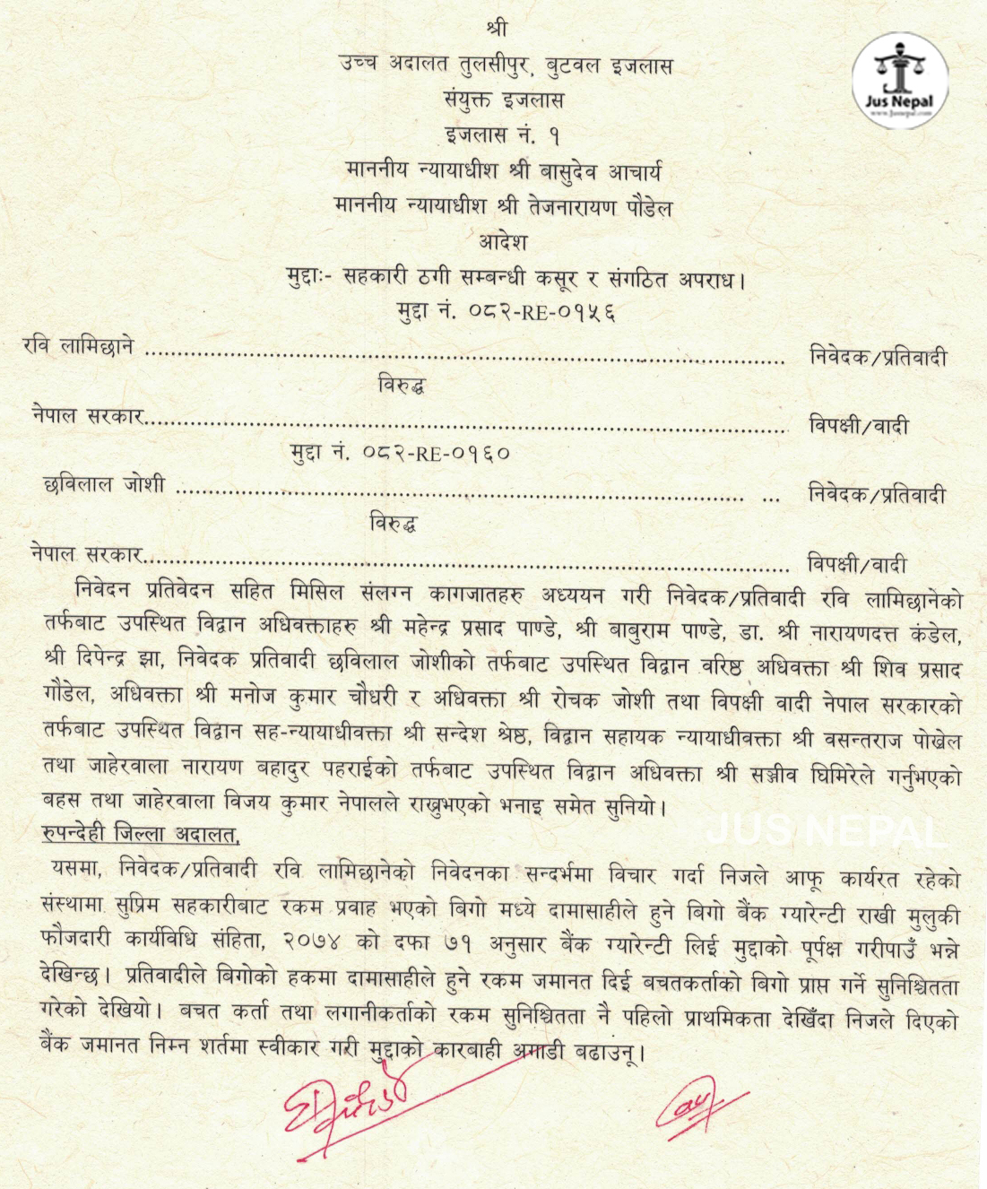 यसअघि जिल्ला अदालत रूपन्देहीले गत माघ १३ गते एक करोड रुपैयाँ धरौटी राखेर लामिछानेलाई रिहा गर्न आदेश दिएको थियो । जिल्ला अदालतको आदेशविरुद्ध सरकारी वकिल कार्यालय उच्च अदालत पुगेको थियो ।