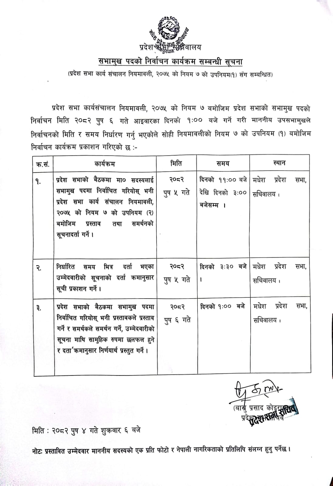नयाँ सभामुख चयन गर्न प्रदेशसभामा हिजो शनिबार नै प्रदेशसभा कार्यसञ्चालन नियमावली, २०७५ को नियम ७ को उपनियम (२) बमोजिम प्रस्ताव तथा समर्थनको सूचना दर्ता भइसकेको छ । त्यस्तै; प्रदेश सभा सचिवालयले निर्धारित समयभित्र दर्ता भएका उम्मेदवारीको सूचनाको दर्ता क्रमानुसार सूची प्रकाशन पनि गरिसकेको छ ।