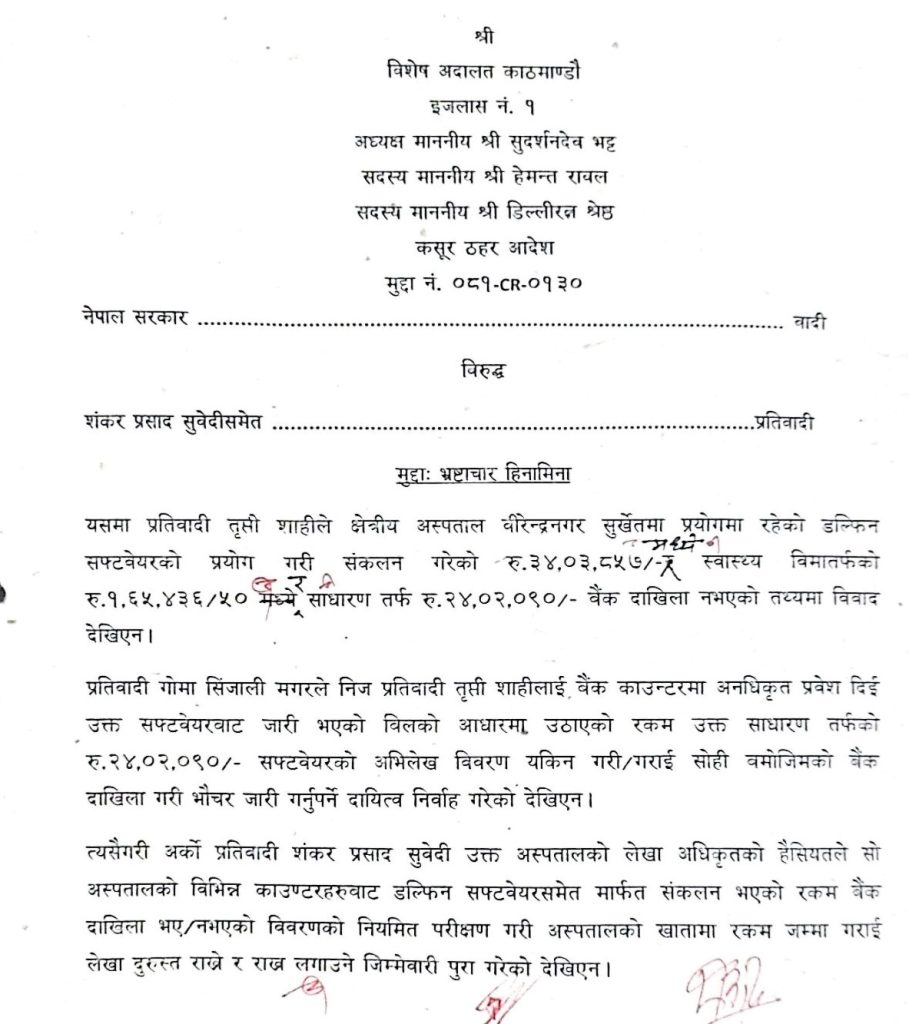 विशेष अदालतका अध्यक्ष न्यायाधीश सुदर्शनदेव भट्ट, न्यायाधीश हेमन्त रावल र डिल्लीरत्न श्रेष्ठको इजलासले आइतबार अस्पतालमा बैंक एक्सटेन्सन काउन्टर इन्चार्ज गोमा सिंजाली मगर, तत्कालीन लेखा अधिकृत शंकरप्रसाद सुवेदी र प्रतिवादी तृप्ति शाहीलाई दोषी ठहर गरेको हो।