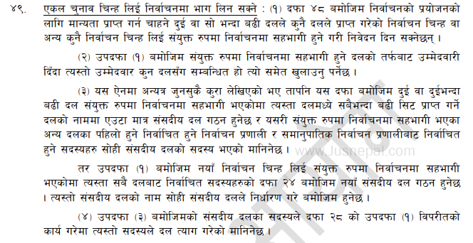 राजनीतिक दलसम्बन्धी ऐन, २०७३ को दफा ४९ ले एकल चुनाव चिन्ह प्रयोग गरी संयुक्त रूपमा निर्वाचनमा सहभागी हुन सक्ने कानुनी आधार दिएको छ। जसमा दुई वा दुईभन्दा बढी दलले एउटै दलको चिन्ह वा नयाँ चिन्ह लिएर संयुक्तरूपमा निर्वाचनमा सहभागी हुन निवेदन दिन सक्छन्। भनिएको छ ।