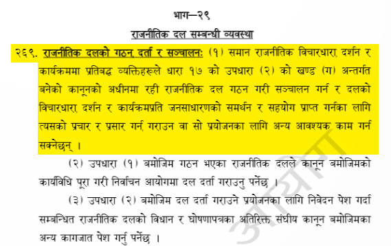 धारा २६९ ले समान राजनीतिक विचारधारा, दर्शन र कार्यक्रममा प्रतिवद्ध व्यक्तिहरूले कानुनबमोजिम राजनीतिक दल गठन, दर्ता र सञ्चालन गर्न सक्छन् तथा जनसमर्थन प्राप्त गर्न प्रचार–प्रसार गर्न भनेको छ ।