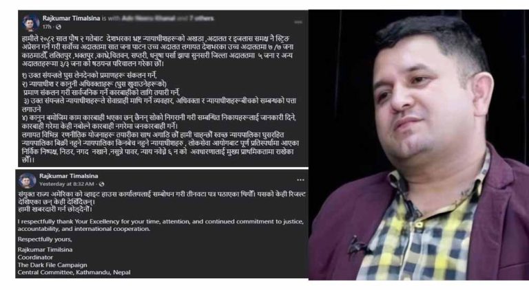 काठमाडौं । आफूलाई ‘डार्क फाइल अभियान, केन्द्रीय समितिको संयोजक’ बताउने राजकुमार तिमल्सिनाले सामाजिक सञ्जाल फेसबुकमा स्टाटस लेख्दै ‘देशभरका भ्रष्ट न्यायाधीहरुको अखडा’ मा स्टिङ अप्रेशन गर्ने गरी मान्छे परिचालन गरेको र उनीहरुले ‘भ्रष्टलाई जनकारबाही गर्ने’ गर्ने सार्वजनिक घोषणा गरेका छन् । यतिमात्र नभएर तिमल्सिनाले सर्वोच्च अदालतका न्यायाधीश शारंगा सुवेदी, नहकुल सुवेदी र सुनील कुमार पोखरेलको उल्टो … Continue reading न्यायाधीशमाथि ‘जनकारबाही’ गर्ने चेतावनी, के अदालतविरुद्ध आन्दोलन छेड्न पाइन्छ ?