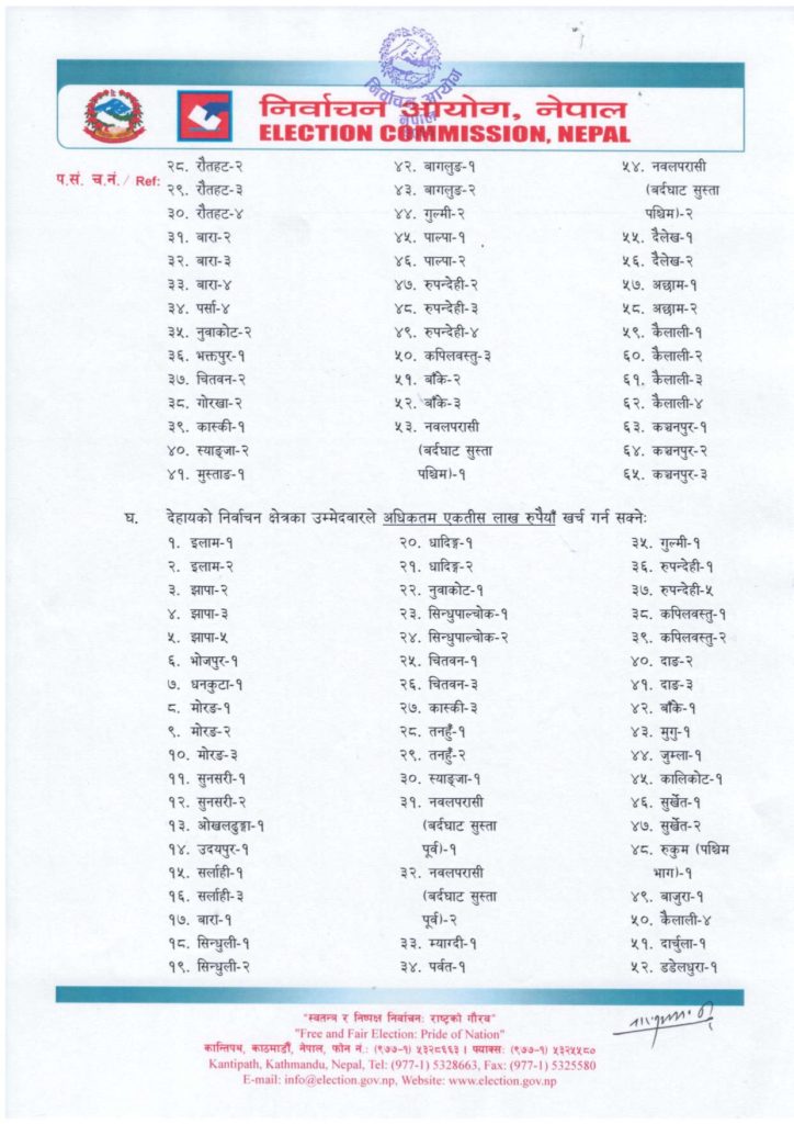 आयोगद्वारा जारी विज्ञप्तिअनुसार सुगम जिल्लाका निर्वाचन क्षेत्रमा एकजना उम्मेदवारले २५ लाख रुपैयाँसम्म खर्च गर्न पाउने छ भने भौगोलिक हिसाबले दुर्गम जिल्लामा रहेका निर्वाचन क्षेत्रहरुमा ३३ लाखसम्म खर्च गर्न पाइने छ ।