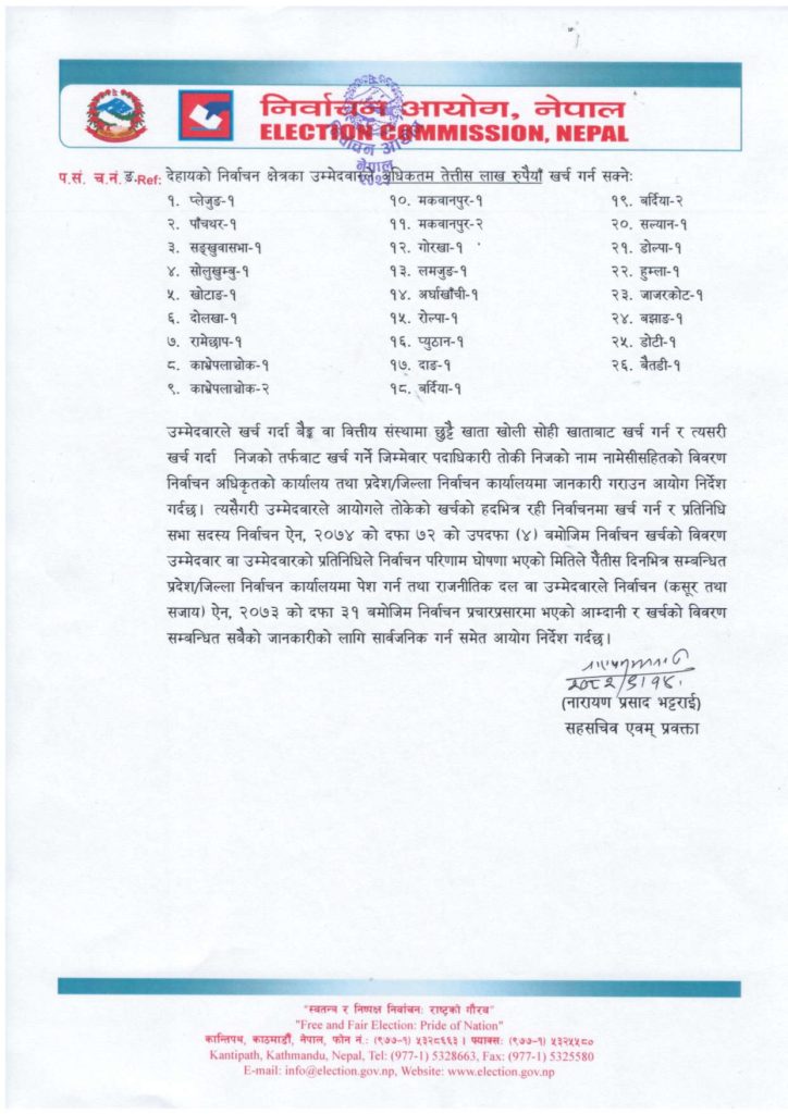 उम्मेदवारहहरुले आयोगले तोकेको खर्चको हदभित्र रही निर्वाचनमा खर्च गर्न भनिएको छ ।