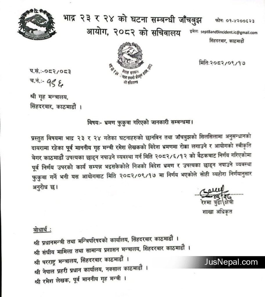 आयोगका अनुसार यसअघि भदौ १२ गते बसेको बैठकले अनुसन्धानका क्रममा पूर्वगृहमन्त्री लेखकको विदेश भ्रमणमा रोक लगाउने र काठमाडौं उपत्यका छाड्न नपाउने निर्णय गरेको थियो। तर हाल सो निर्णयको उद्देश्य पूरा भइसकेकाले उक्त व्यवस्था फुकुवा गर्नुपर्ने निष्कर्षमा आयोग पुगेको पत्रमा उल्लेख छ।