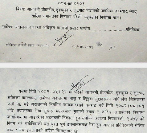 ०८२ भदौ २४ गते देशका विभिन्न भागमा भएको हिंसात्मक आन्दोलनका क्रममा सर्वोच्च अदालतसहित मातहतका अदालतहरूमा आगजनी, तोडफोड र लुटपाट भयो। यस घटनाबाट अदालतका भवन, इजलास, सूचना प्रविधि प्रणाली, चालु, छिनुवा, प्रमाण र सुरु मुद्दाका मिसिलहरू तथा ऐतिहासिक न्यायिक अभिलेखहरू नष्ट भए। जसका कारण अदालतको नियमित सेवा प्रवाह पूर्णरूपमा अवरुद्ध भयो। बन्दी प्रत्यक्षीकरण र अत्यावश्यक सेवाबाहेक अन्य सबै सेवा स्थगन गरियो र अदालत करिब एक महिना शून्य अवस्थामा पुग्यो । गत पुस ११ गते सर्वोच्च अदालतका शाखा अधिकृत वालाजी प्रसाद पाण्डेय प्रतिवेदकका रूपमा उपस्थित भएर एउटा न्यायिक प्रक्रिया अगाडि बढाइयो ।