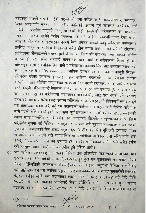१. मिति ०८२ भदौ २४ मा भएको आगजनी, तोडफोड र लुटपाट समेतका कारणबाट यस अदालतको भौतिक संरचना, सूचना प्रविधि प्रणाली र चालु मुद्दाहरूको अधिकांश मिसिलहरूसमेत जली नष्ट भएकाले यस अदालतबाट प्रवाह हुने सेवा सुचारु हुन नसकी अवरुद्ध भएको ।