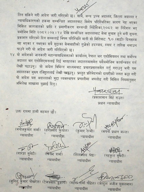 सर्वोच्च अदालतका प्रधान न्यायाधीश प्रकाशमान सिंह राउतसहित १९ जना न्यायाधीश संलग्न वृहत् पूर्ण इजलासले आदेश (०८२-RE-०१०१) जारी गर्दै हदम्याद, म्याद र तारिख थाम्न पाउने अवधि थप ६० दिनसम्म थप गर्ने निर्णय गरेको छ ।