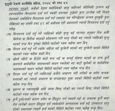 काबु वाहिरको परिस्थिति उत्पन्न भई हदम्यादभित्र फिरादपत्र दर्ता गर्न नसकी हदम्याद गुज्रेको कुरा उल्लेख गरी निजले फिरादपत्र दर्ता गर्न ल्याएमा दफा ५९ को अधीनमा रही अदालतले त्यस्तो फिरादपत्र दर्ता गर्नुपर्ने मुलुकी देवानी कार्यविधि संहितामा व्यवस्था छ ।