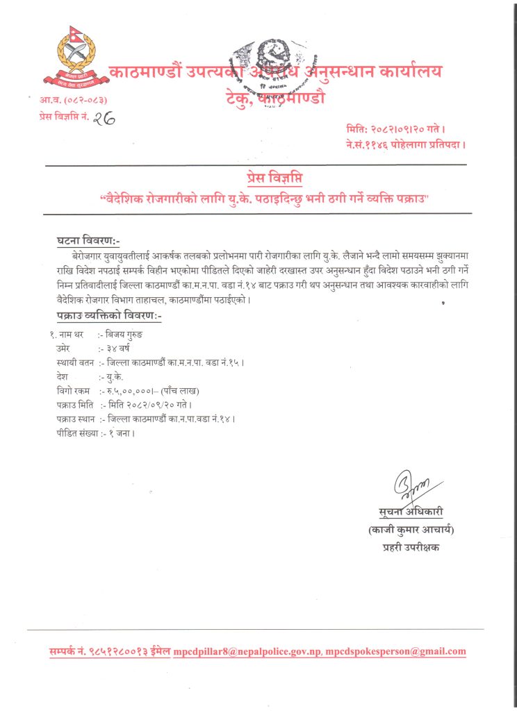 काठमाडौं उपत्यका अपराध अनुसन्धान कार्यालय टेकुले युके पठाइदिन्छु भनी बेरोजगार युवतीहरूलाई प्रलोभनमा पारी ठगी गर्ने व्यक्ति पक्राउ गरेको हो। पक्राउ पर्नेमा काठमाडौं महानगरपालिका–१४ स्थायी ठेगाना भएका ३४ वर्षीय विजय गुरुङ रहेका छन् ।