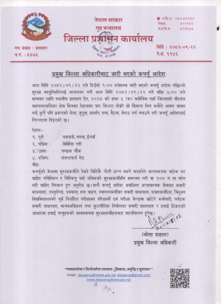 वीरगञ्ज महानगरमा प्रशासनद्वारा अनिश्चितकालीन निषेधाज्ञा जारी