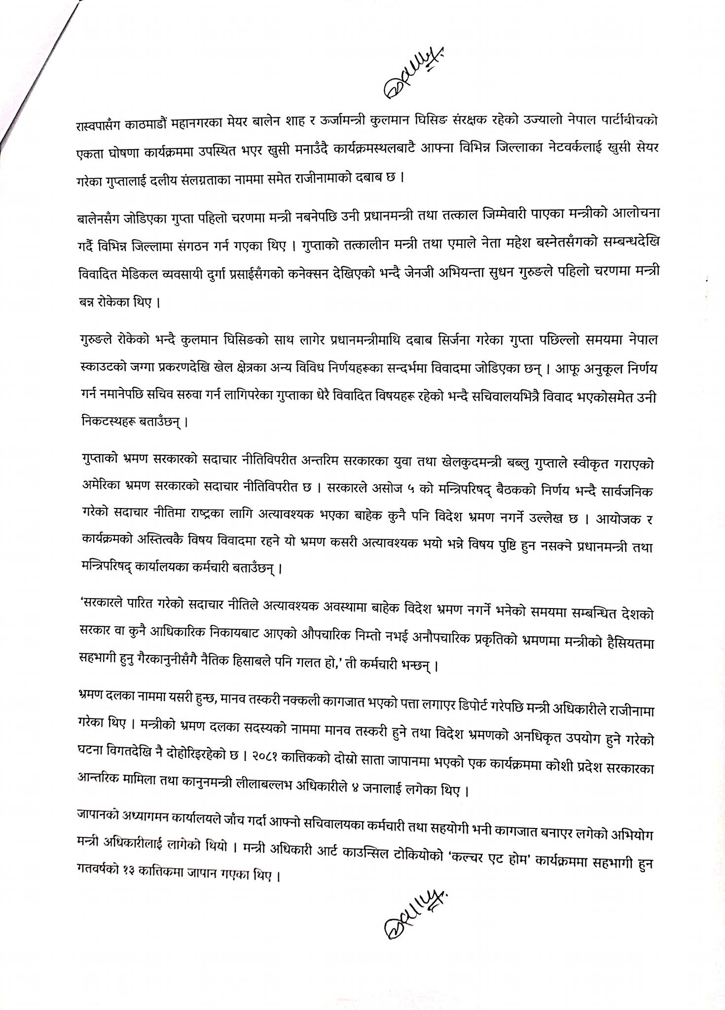 प्रधानमन्त्री सुशीला कार्कीले गुप्तासँग राजीनामा माग गरिसकेकी छिन्‌ । गुप्ताले आफू अमेरिका गएर फर्केपछि राजीनामा बुझाउने बताएका खबर सार्वजनिक भइरहेका छन्‌ ।