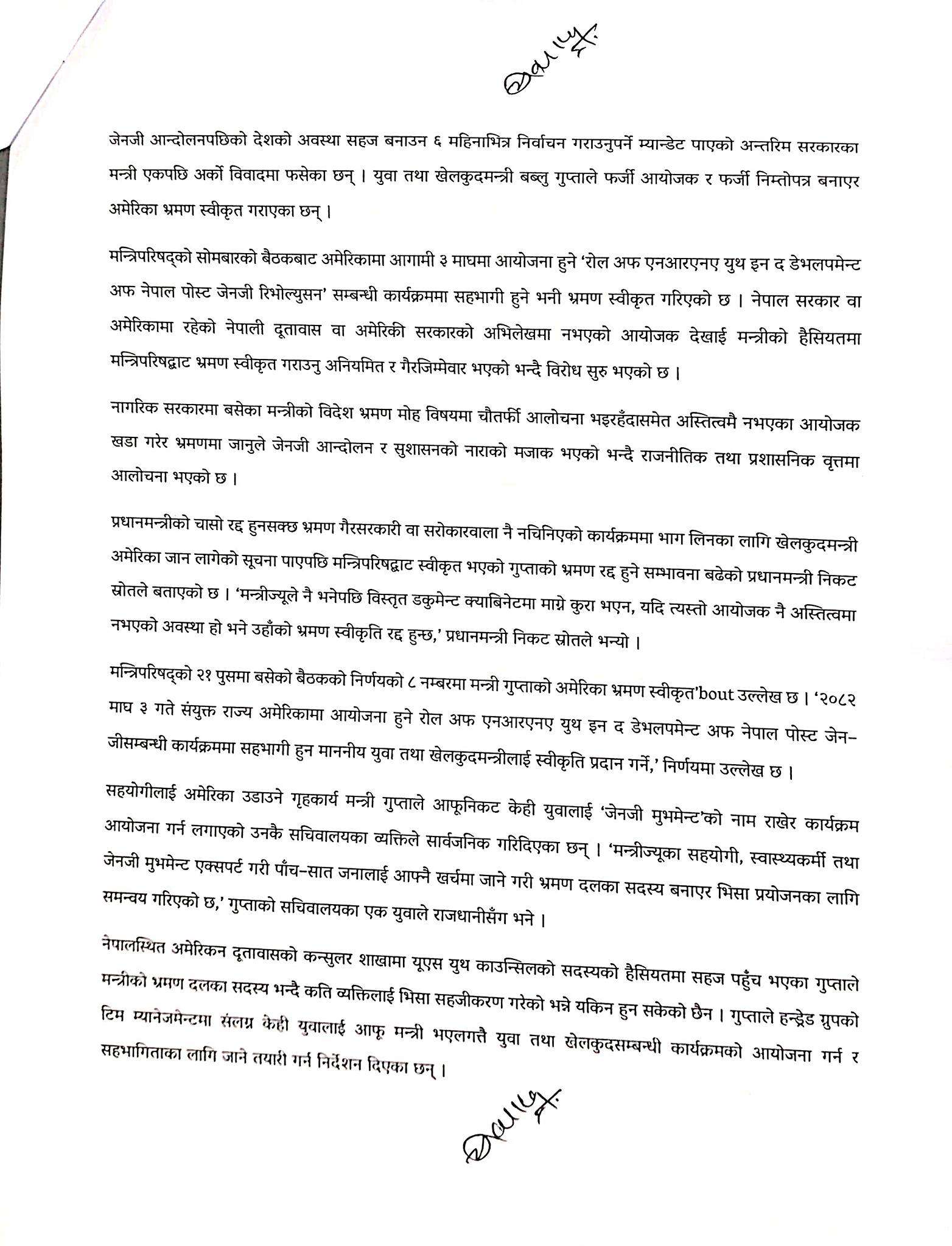 काठमाडौँ । वर्तमान जेन-जी सरकारका युवा तथा खेलकुदमन्त्री बब्लु गुप्ताविरुद्ध अख्तियार दुरुपयोग अनुसन्धान आयोगमा उजुरी परेको छ । उनीविरुद्ध अमेरिका भ्रमणको निहुँमा मानवतस्करी गर्न खोजेको उजुरीपत्रमा उल्लेख छ ।