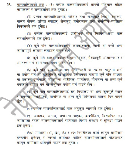 त्यसैगरी धारा ३९ को उपधारा २ मा भनिएको छ, ‘प्रत्येक बालबालिकालाई परिवार तथा राज्यबाट शिक्षा, स्वास्थ्य, पालन पोषण, उचित स्याहार, खेलकूद, मनोरञ्जन तथा सर्वाङ्गीण व्यक्तित्व विकासको हक हुनेछ ।’