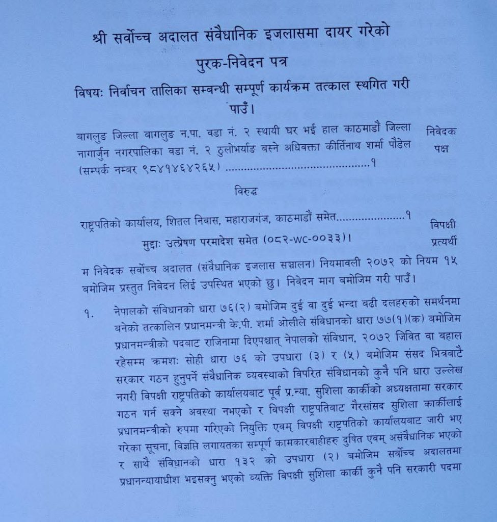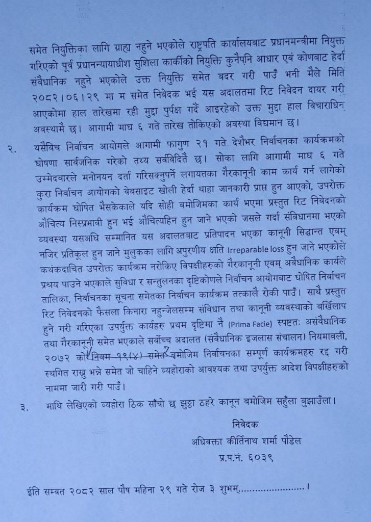काठमाडौं । आगामी फागुन २१ गते तय गरिएको प्रतिनिधिसभा निर्वाचनको प्रक्रिया रोक्न माग गर्दै सर्वोच्च अदालतमा रिट निवेदन दर्ता भएको छ। अधिवक्ता कीर्तीनाथ शर्मा पौडेलले राष्ट्रपति कार्यालय र प्रधानमन्त्री कार्यालयलाई विपक्षी बनाएर रिट दायर गरेका हुन्।