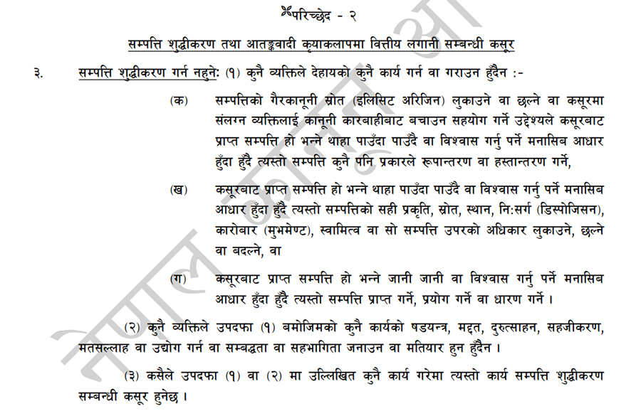 क. सम्पत्तिको गैरकानूनी स्रोत (इलिसिट अरिजिन) लुकाउने वा छल्ने वा कसूरमा संलग्न व्यक्तिलाई कानूनी कारबाहीबाट बचाउन सहयोग गर्ने उद्देश्यले कसूरबाट प्राप्त सम्पत्ति हो भन्ने थाहा पाउँदा पाउँदै वा विश्वास गर्नु पर्ने मनासिब आधार हुँदा हुँदै त्यस्तो सम्पत्ति कुनै पनि प्रकारले रूपान्तरण वा हस्तान्तरण गर्ने,