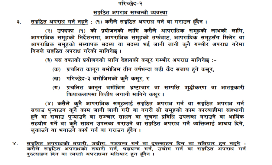 त्यसैगरी, कसैले सङ्गठित अपराधको तयारी गर्न, षडयन्त्र गर्न, उद्योग गर्न वा सङ्गठित अपराध गर्न दुरुत्साहन दिन वा त्यस्तो अपराधमा मतियार हुन नहुने ऐनमा व्यवस्था छ ।