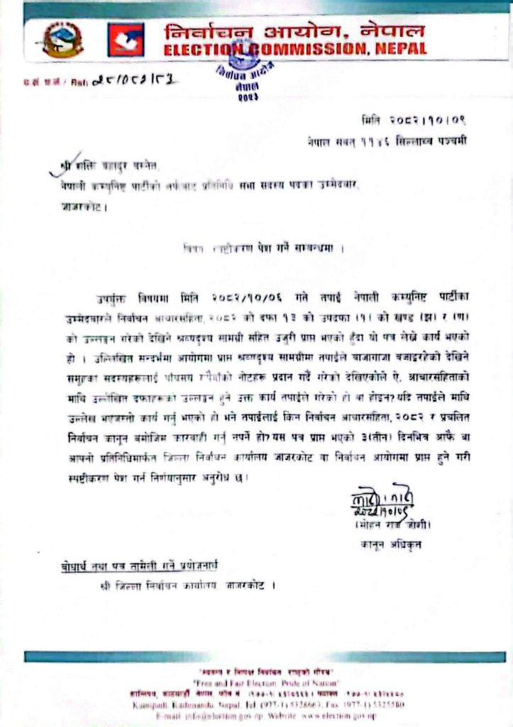 आयोगले पत्र प्राप्त भएको मितिले तीन दिनभित्र स्वयं वा प्रतिनिधिमार्फत निर्वाचन कार्यालय जाजरकोट वा निर्वाचन आयोगमा स्पष्टीकरण पेश गर्न निर्देशन दिएको छ ।