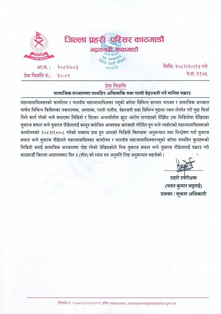 काठमाडौँ । महान्यायाधिवक्ताको कार्यालय र महान्यायाधिवक्ता सविता भण्डारीविरुद्ध तथ्यहीन, आपत्तिजनक र भ्रामक सामग्री तयार गरी सामाजिक सञ्जालमा प्रसारण गरेको आरोपमा युवराज सफल भन्ने युवराज पौडेल पक्राउ परेका छन् ।
