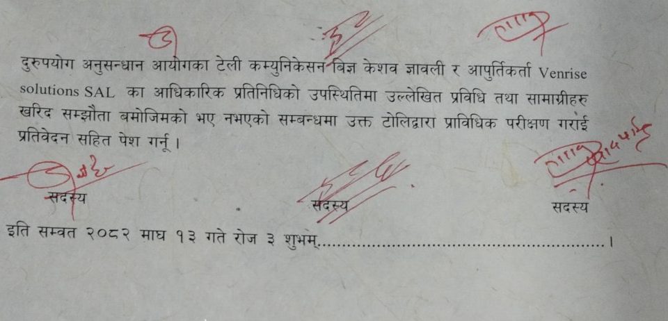 विशेष अदालतको आदेशमा भनिएको छ, ‘अख्तियार दुरुपयोग अनुसन्धान आयोगका टेली कम्युनिकेसन विज्ञ केशव ज्ञवाली र आपूर्तिकर्ता ख्भलचष्कभ कयगितष्यलक क्ब्ी का आधिकारिक प्रतिनिधिको उपस्थितिमा उल्लेखित प्रविधि तथा सामाग्रीहरु खरिद सम्झौता बमोजिमको भए– नभएको सम्बन्धमा उक्त टोलीद्वारा प्राविधिक परीक्षण गराई प्रतिवेदनसहित पेश गर्नु ।’